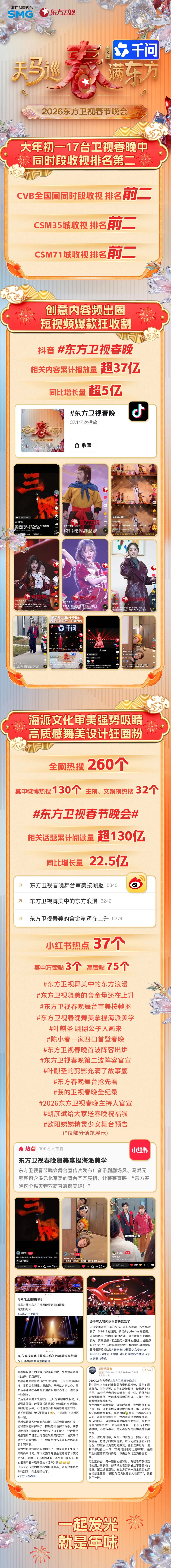 当晚抖音以“东方卫视春晚”为话题的视频累计播放量超37亿,同比增长超5亿。高质感海派舞美强势出圈,以“东方卫视春节晚会海派审美”、“东方春晚舞美”为话题的内容引发热烈讨论,引爆全网热搜260个,总阅读量突破130亿,彰显强大影响力。