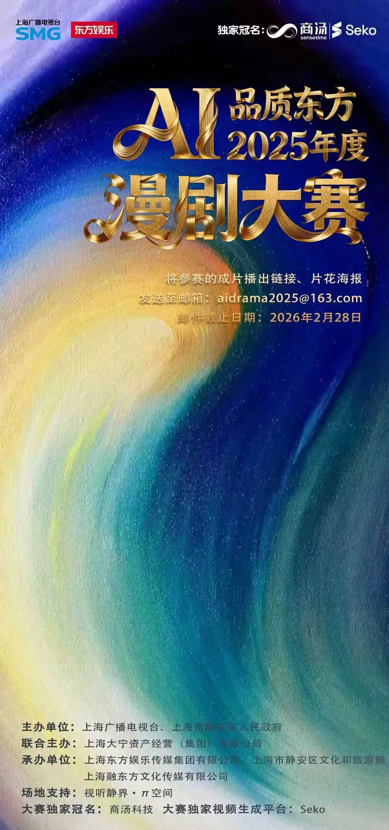(三)参赛作品需在2026年2月28日前完成提交(逾期提交作品不予受理,提交后内容不可修改,无版权纠纷),可配合后续展映、宣传等相关活动。参赛者可将参赛的成片播出链接、片花海报发送至邮箱:aidrama2025@163.com