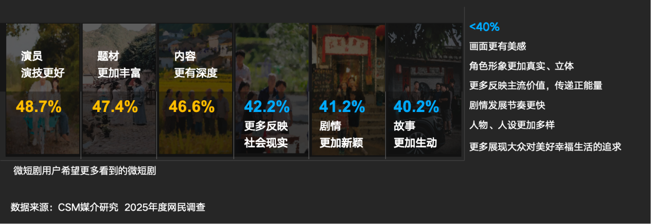 CSM媒介研究的用户调查显示,演技扎实、题材广度、内容深度、现实关怀、剧情新颖是TOP5期待项;