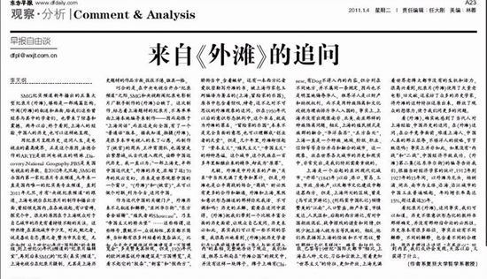 五集历史人文纪录片《外滩》在纪实频道播出以来,反响热烈。1月4日《东方早报》在“观察·分析”版面头条位置刊登了复旦大学哲学系教授李天纲的评论文章《来自<外滩>的追问》。以下为全文: