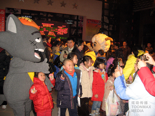 记者在走访上海新世纪影城时还巧遇了这两位“巨星”。他们不仅热情地摆出各种姿势任影迷合照,“灰太狼”还现场闹起了“小脾气”。当问及更喜欢“喜羊羊”还是“灰太狼”时,不少小粉丝都毫不犹豫地选择了聪明的“喜羊羊”,这可让一旁的“狼大王”丢尽了面子,甩着头就准备“扬长而去”。此时,一个小女孩突然大声地说:“灰太狼,他们不喜欢你,我喜欢你!”这大胆的表白可乐坏了“狼大王”,立即飞奔上前搂着小女孩又抱又亲,还不忘跑到喜羊羊面前“示威”,逗趣的表现让观众都忍俊不禁。