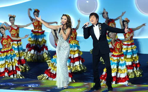 歌手孙楠、李玟在近200个国家和地区的旗帜簇拥下,唱响第14届国际泳联世界锦标赛的主题曲《梦,在东方的海上》,为16天的激情飞扬,开启大门。