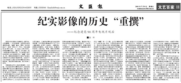 7月8日,《文汇报》“文艺百家”版面在头条位置刊登了名为《纪实影像的历史“重撰”——纪念建党90周年电视片观后》的文章。作者系复旦大学新闻学院教授、博士生导师陆晔。她在文中指出,在纪念建党90周年之际,以《1921点亮中国》、《理想照耀中国》、《誓言》为代表的一批上海原创纪实影像作品,既是利用影像对中国共产党诞生发展的历史过程进行重新审视,也是对于以往未能被大众媒介有效传播的党史研究新视角、新成果的影像进行发掘、展示和深入思考。