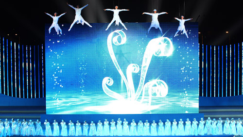 现场的跳水池与练习池之间,以LED方式无缝连接,形成连贯一体、碧波荡漾的水舞台,演员们宛如在水上表演,如梦似幻。游泳池区域还安置有可从水下神奇升起的水中升降台,以及凌波平移的水中车台。水池四周是壮观的环绕喷泉,与流动开合的舞台背景一同带来震撼人心的立体视觉效果。