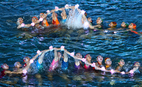 形态各异的水中动物形象的卡通人偶在水池内外尽情嬉闹、竞技,表演水上自行车、水上特技球等,以诙谐幽默的方式,呈现出一个精彩的“卡通水上运动会”,呈现出水带来的最纯真的快乐;滑稽跳水、水上拉拉操、水上踢踏舞、水上杂技等表演也同时把水的缤纷动感演绎到极致。