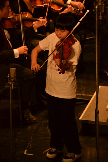 随后,指挥家曹鹏先生向大家介绍了一位名为周舒亦的小男孩,他非常喜欢音乐,在参加“天使知音沙龙”后,城交的演奏员开始教他拉小提琴,教他弹钢琴,从此周舒亦学会了与小朋友和睦相处,通过学音乐他学会了听老师的话,现在他已经是上海城市青少年交响乐团的一员。上海城市交响乐团的慈善爱心打开了周舒亦封闭的内心世界,带领他走进了无限宽广的音乐世界。随后周舒亦小朋友领奏,与乐团合作演绎了一曲《春天》,周舒亦的演奏认真投入,饱含激情,深深地打动了每一位观众,大家为他送上了热烈的掌声。