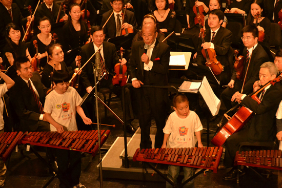 第一首乐曲结束后,工作人员在舞台上架起了十一台木琴,十一位患有自闭症的儿童走上舞台,他们与乐团共同合作演奏了改编自英国童谣的著名乐曲《小星星》。当音乐响起,孩子们快乐地敲打着木琴,脸上洋溢着纯真的欢乐,孩子们的演奏赢得了台下观众如雷的掌声,大家都为这些孩子感到骄傲,也为乐团对自闭症孩子的关爱表示了崇高的敬意。