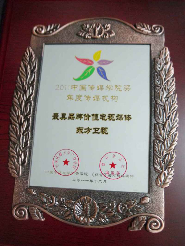 上周末,由中国传媒大学主办、《媒介》杂志承办的第四届中国传媒趋势论坛在京召开。在论坛举办的“2011中国传媒学院奖”颁奖典礼上,东方卫视荣获“年度传媒机构最具品牌价值电视媒体”大奖。颁奖词这样评价了东方卫视的品牌价值:“东方卫视是具有国际视野、中国顶尖的电视新闻、节目内容制作与内容平台运营商。自开播以来,其坚持原创的精神、对社会主流价值的传播以及大量独播、定制的内容都为频道赢来了上佳的收视表现和广泛的网络点击、转载,集中体现了东方卫视在新闻领域的吸引力、公信力和影响力。”