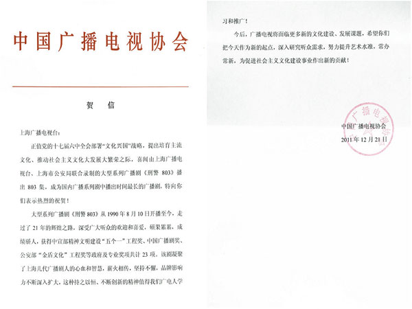 贺信中写到:“正值党的十七届六中全会提出培育主流文化、部署“文化兴国”战略、推动社会主义文化大发展大繁荣之际,喜闻由上海广播电视台、上海市公安局联合录制的大型系列广播剧《刑警803》播出803集,成为国内广播系列剧中播出时间最长的广播剧,特向你们表示热烈的祝贺!大型系列广播剧《刑警803》从1990年8月10日开播至今,走过了二十一年的辉煌之路,深受广大听众的欢迎和喜爱,硕果累累,成绩骄人,共获得了中宣部精神文明建设“五个一”工程奖、中国广播剧奖、公安部“金盾文化”工程奖等在内的政府及专业奖项共计23项。该剧凝聚了上海几代广播剧人的心血和智慧,薪火相传,坚持不懈,将品牌影响力不断深入扩大,这种持之以恒、不断创新的精神值得我们广播人学习和推广!”