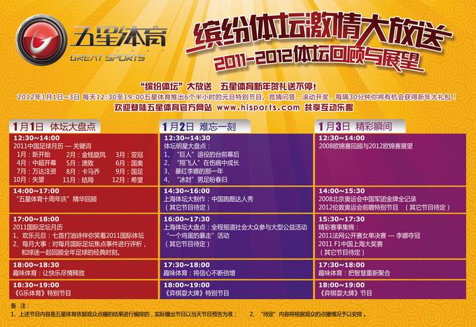 2012年1月1日——3日每天中午12:30至19:00,五星体育推出6个半小时的元旦特别节目:“缤纷体坛激情大放送——2011-2012体坛回顾与展望”,王牌主持李兵震撼出击、顶级明星集中亮相,五星体育精心遴选出的高收视率赛事菜单,通过“你点我播”、观众投票的结果进行集群播放,让大家共同体验与电视互动的乐趣。竞猜问答,滚动开奖,每隔30分钟,观众将有机会获得五星体育送出的新年大礼包!欢迎登陆五星体育官方网站 www.hisports.com 共享互动乐趣。元旦三天假期,锁定五星体育!