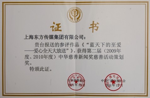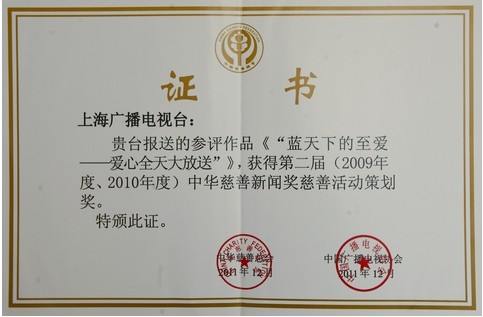 第二届(2009年度、2010年度)中华慈善新闻奖评选于2011年12月揭晓,由我台、集团报送的《“蓝天下的至爱”——爱心全天大放送》节目荣获“中华慈善新闻奖慈善活动策划奖”。