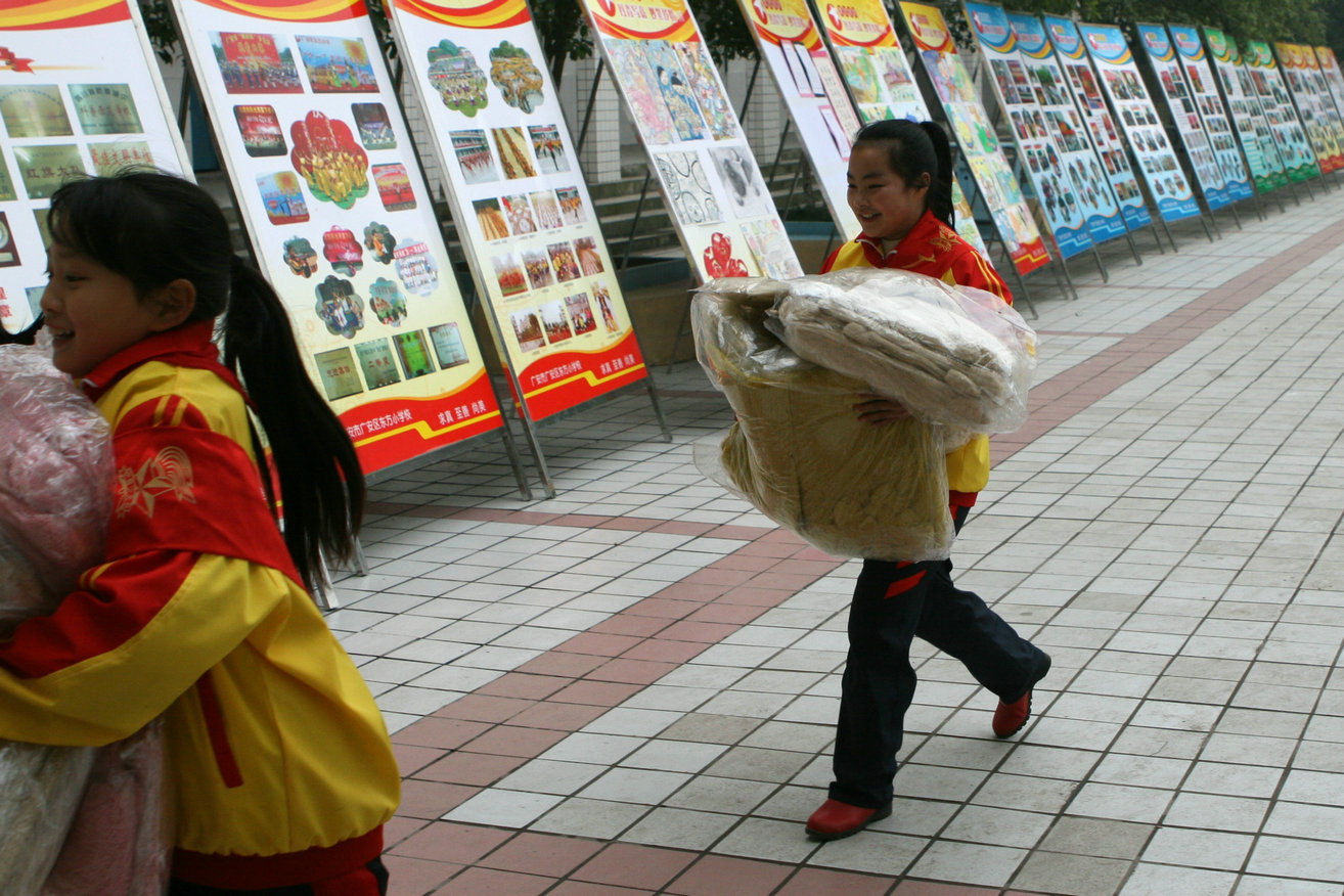 12月29日一早,大家又出发了,经过近两个小时的车程,达到了目的地——四川广安。为了不影响孩子们的正常上课,活动安排在了下午。广安东方小学的师生们用鼓乐和鲜花欢迎“上海来的亲人”,并为大家一一戴上了红领巾,孩子们的热情让大家深深感动。当看到一袋袋御寒用品被卸下车时,孩子们都雀跃了起来,纷纷跑上前来当起了“小搬运工”。