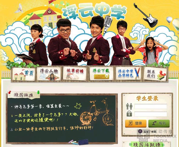在《神马兄弟》热闹开播的同时,其官方网站“浮云中学网站”也同步上线。该网站以剧中主角们所在学校——浮云中学为原型,打造了一个虚拟的高校网络,其中不但有招生、社团招募、留言板等模拟真实学校网站的板块设置,更有为剧迷追剧所特别呈现的剧情前瞻、人物介绍、宣传片在线看、主题桌面下载等精彩资讯内容,相信随着《神马兄弟》的热播,无论是剧中还是网上的这所“浮云中学”都将笑料不断,新闻不停。