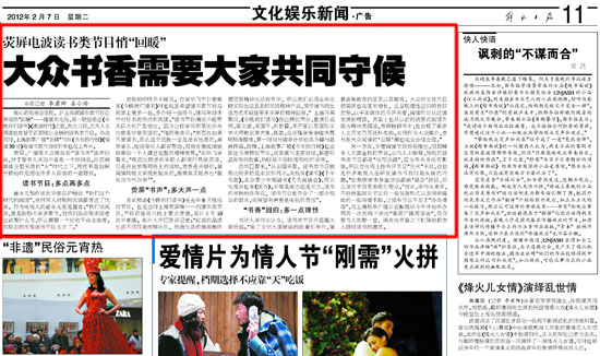 崔永元和作家余华曾在沪畅谈“我们这个时代的阅读”,当时两人对现时阅读都表达了忧虑。作为电视人的崔永元更是直言:“我们说阅读,就是鼓励大家多看书,但我们没法强求读者应该看什么书,所以需要一个好的平台去推荐。但现在的电视读书节目太少了。”