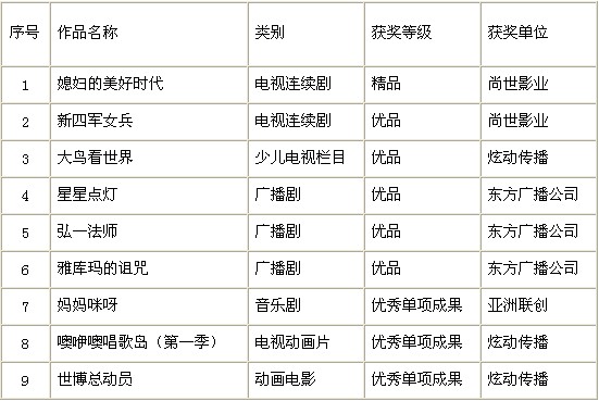 由上海市委宣传部组织评选的2011年度上海文艺创作精品优品、文艺家评选今天(8日)在上海锦江小礼堂举行颁奖典礼,我台共有9部作品获奖,尚世影业、炫动传播、亚洲联创、东方广播公司等获奖单位代表上台领奖。