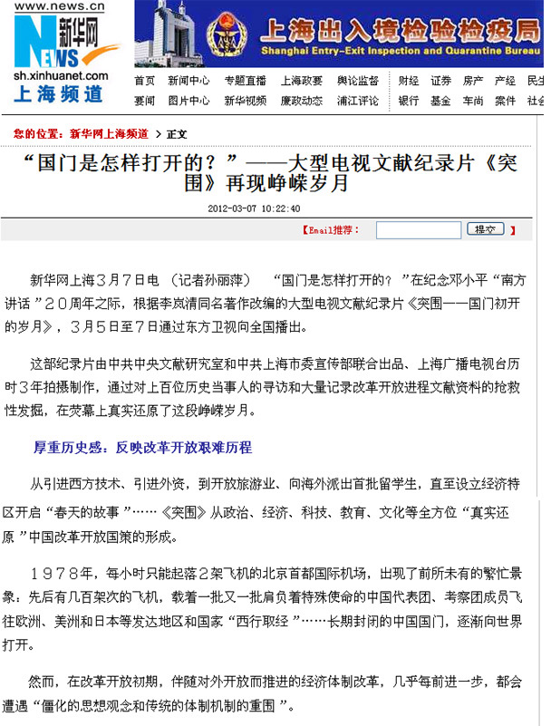 “国门是怎样打开的?”在纪念邓小平“南方讲话”20周年之际,根据李岚清同名著作改编的大型电视文献纪录片《突围——国门初开的岁月》,3月5日至7日通过东方卫视向全国播出。