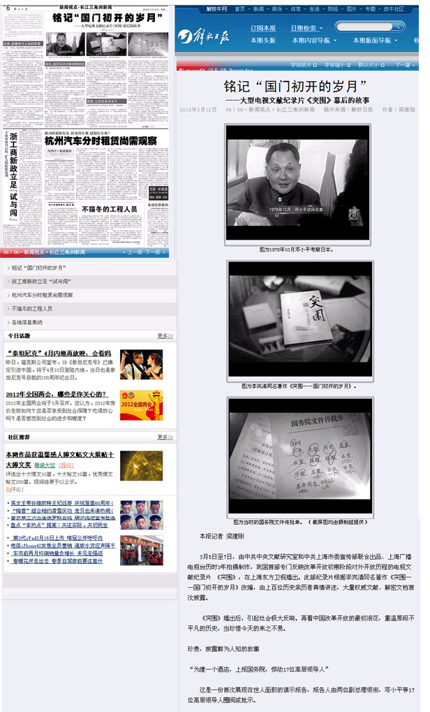 3月5日至7日,由中共中央文献研究室和中共上海市委宣传部联合出品、上海广播电视台历时3年拍摄制作,我国首部专门反映改革开放初期阶段对外开放历程的电视文献纪录片 《突围》,在上海东方卫视播出。此部纪录片根据李岚清同名著作《突围——国门初开的岁月》改编,由上百位历史亲历者真情讲述,大量权威文献、解密文档首次披露。
