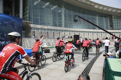 仪式尾声,在中国国际广播电台副台长夏吉宣和上海广播电视台党委书记王建军的共同发令下,一支绿色低碳的自行车队从现场出发,带着全体参与者的环保心愿,向虹桥路广播大厦进发。百余面“手拉手,爱地球”绿色小旗随着车轮沿路呼唤市民践行绿色、低碳出行。