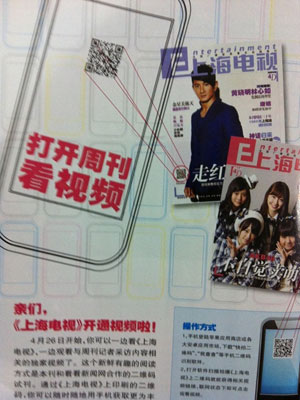 《每周广播电视报》和《上海电视》的读者4月26日开始可以在阅读刊物的同时观看相关的视频新闻了。这个新鲜的阅读方式是基于看看新闻网与每周广播电视报社达成的平面媒体二维码试刊合作,通过纸质刊物封面印刷的二维码,读者可以随时随地获取更为丰富的视频新闻内容。