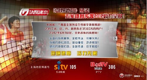 6月1日闪亮登场的《劲爆体育》频道,每日黄金时段3-6小时的新闻、赛事节目直播将开创中国数字电视频道的先例,为打造中国数字电视权威体育平台夯下坚实基础。记住《劲爆体育》在全国各地的频道号吧:北京141,上海sitv105,上海iptv306,南京70,重庆131,石家庄69,福州109,厦门69,天津456,广州99等等。