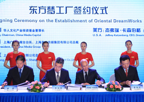 7日正式签字成立的上海东方梦工厂影视技术有限公司主要负责影视内容制作及其衍生产业的开发。未来数年里,将有上千人的中外动画影视创作精英汇聚于此,运用梦工厂全球领先的电脑动画创意流程和技术,生产中国元素、全球发行的动画作品。2016年,上海东方梦工厂将与美国梦工厂联合拍摄出品《功夫熊猫3》,首部由东方梦工厂本土原创的动画电影将于2017年面向全球发布,随后将以每年1至3部的速度形成规模,达到国际一流动画公司的运营水准。在动画产品面世的基础上,东方梦工厂还将涉足版权发行、衍生消费品、网络游戏、音乐剧等的现场娱乐等领域,形成以动画为核心的完整的家庭娱乐产业链,目标是成为中国目前最大的、同时与国际顶尖水准直接接轨的动画生产基地、技术研发高地和人才孵化汇聚之地。