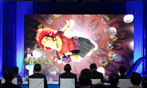 在蓝色梦幻般的舞台上,随着俞正声、韩正、张丕民三位领导共同按下启动按钮,代表了五家合作方的五束光线汇集而成一道璀璨的光束投射到现场天幕,天幕之上云霭散去,在月亮上垂钓梦想的熊猫展现在众人的眼前,随之,“东方梦工厂”也首次向公众展开了未来发展的宏伟设计蓝图和先进文化产业的创想理念。上海广播电视台台长、上海东方传媒集团有限公司总裁裘新代表SMG签约,台党委书记王建军、副台长李蓉、副总裁楼家麟出席签约仪式。