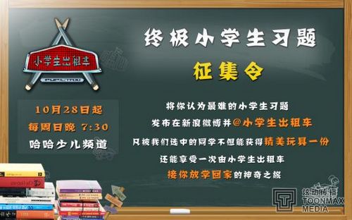 从10月开始,每个月节目主持人小新与楚楚将率领小学生出租车与载有5位单科学习小达人的“少先队号”一起来到申城街头,寻找乘客参与挑战。同时,节目组更向全市小学生发出了最难习题征集令。为了鼓励孩子们学习的信心,只要将你认为最难的小学生习题发布在新浪微博并@小学生出租车,凡是被节目组选中的“终极习题”,出题同学都将获得节目组送出的精美玩具,同时还能享受一次由小学生出租车节目送回家的“神奇之旅”。