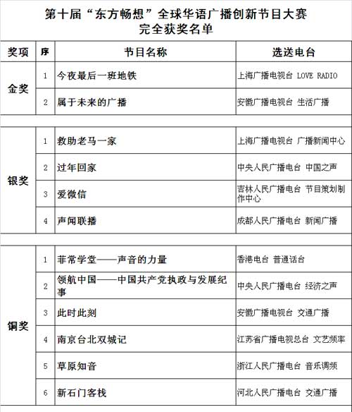 第十届“东方畅想”全球华语广播创新节目大赛4月19日在沪举行颁奖典礼,由上海广播电视台LOVERADIO选送的《今夜最后一班地铁》、安徽广播电视台生活广播选送的《属于未来的广播》荣获大赛金奖。