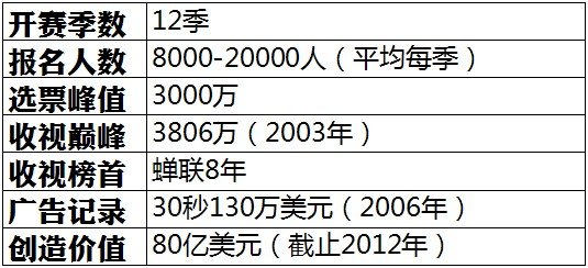 自2002年开播以来,《美国偶像》已成为美国电视史上收视率最高节目之一,连续7年勇夺收视率排行榜冠军,从以往动辄3000万的选票也可看出,几乎每个美国家庭都参与投票,如此盛况堪与美国总统选举相媲美。