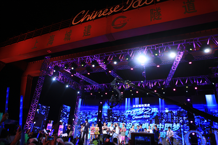 近期,上海遭遇罕见高温,连发高温红色预警,尽管音乐比拼进入越来越紧张的最后阶段,东方卫视大型音乐真人秀《中国梦之声》还是推出特别节目,向奋战在高温第一线的城市建设者致敬,以实际行动为在连续高温情况下奋战的劳动者送去夏日慰问。演出当晚,节目组亲赴黄浦江越江隧道工地,举行了一场《中国梦之声》“致敬建设者 唱响中国梦”高温慰问演出。《中国梦之声》导师韩红、李玟、王伟忠、黄晓明携六强学员艾菲、侯磊、阿来、李祥祥、James、央吉玛以及四十强人气学员邓小坤、许明明等,为隧道建筑工人、市政养护工人、环卫市容工人、医护人员、交警等上海建设者,奉献上一场精彩的夏日演唱会,更为高温中坚守的劳动者送去慰问品,带去夏日最清凉的暖心慰问。