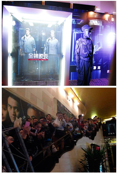 好莱坞动作巨星西尔维斯特•史泰龙和阿诺•施瓦辛格首度联袂主演的越狱题材动作大片《金蝉脱壳》,于11月4日登陆全国各大院线,与翘首以待多时的中国影迷见面。11月3日晚,电影引进发行方上海尚世影业有限公司在上海举行盛大点映,《中国梦之声》超人气选手李祥祥、许明明、罗熙杰、何大为以及沪上一众名嘴潘涛、林海、娄一晨等齐齐亮相点映红毯。而根据《金蝉脱壳》电影情节复制的透明高科技监狱和狱警则成为了当晚一道别样的风景,观众纷纷走进“透明牢房”拍照分享,体验一把“金蝉脱壳”的感觉。