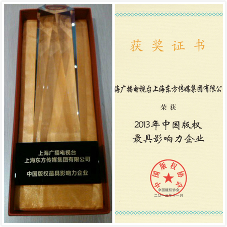 本届年会评选出了2013年度“中国版权事业终生成就者”、“中国版权事业卓越成就者”和“中国版权产业最具影响力企业”等三个奖项。SMG作为广电行业的代表荣膺“中国版权产业最具影响力企业”称号。同时获得“中国版权产业最具影响力企业”称号的还有中央电视台、腾讯网、搜狐网、金山软件、方正电子、西安电视剧版权交易中心、北京国际版权交易中心等企事业单位。