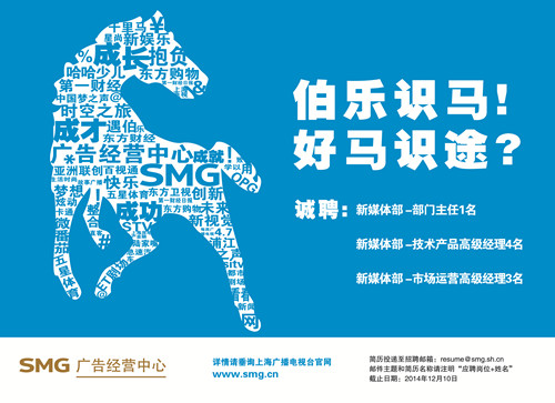 SMG广告经营中心现面向社会广纳贤才,欢迎各位有志同仁积极应聘。