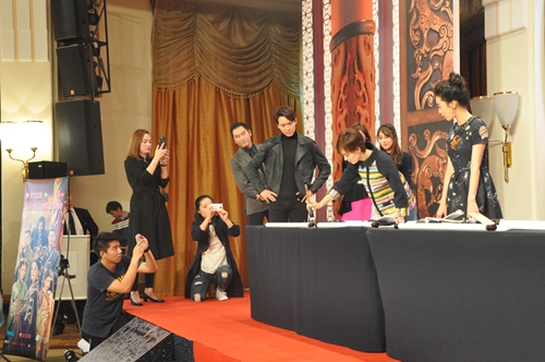 现场热闹非凡,不仅有粉丝上台模仿剧中片段,笑翻全场,还举办了“芈月杯书法大赛”,众演员挥毫泼墨进行比试,导演郑晓龙、制片人曹平、总编剧王小平旁观评判,孙俪领衔的七位演员各书一字,组成了“芈月传收视长虹”七个大字,祝愿《芈月传》在东方卫视收视长虹。