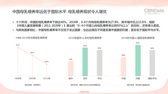 众所周知,母乳是最适合婴儿的食物。而相关研究也显示,母乳喂养不仅为婴儿提供了最佳能量和营养素的来源,还有益于母亲的健康和福祉。因此,世界卫生组织和儿童基金会建议生命最初6个月应进行纯母乳喂养。不过,《报告》显示,中国母乳喂养率较低且呈现持续下降趋势。1998年-2014年这16年期间,中国的母乳喂养率从67%下降至28%,中国母乳喂养率不仅低于发达国家,且比38%的国际平均水平低10个百分点。