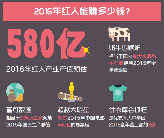 《2016中国电商红人大数据报告》(以下简称《报告》)显示,2016年红人产业产值(包括红人相关的商品销售额,营销收入以及生态其他环节收入),预估接近580亿元人民币,将超过2015年中国电影总票房,也相当于国内最大连锁百货百联集团2015年全年销售额。基于该预测,报告给出了“红人比电影明星更值钱”的断言。