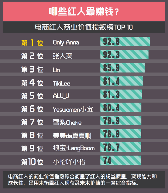 报告中还发布了电商红人商业价值指数榜,综合衡量了网红的粉丝质量、变现能力以及未来成长性之后,最终Only Anna、张大奕、LinForeverGirl 成为了排行榜的TOP3,Tikilee、Alu、小宜,雪梨和美美de夏夏紧随其后。