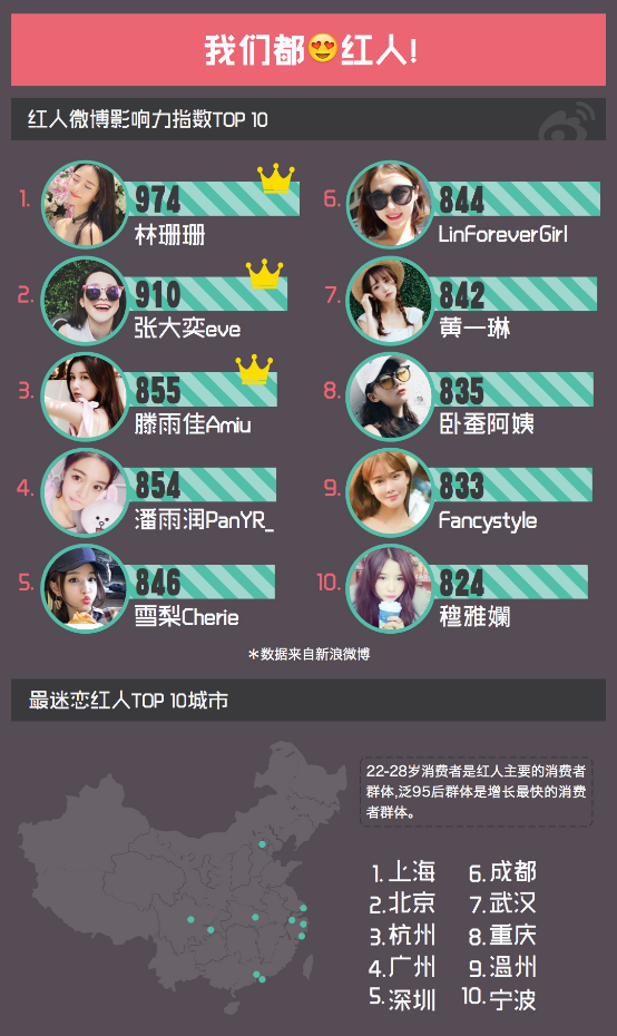 地域分配上,上海、北京、杭州成为了对网红“最买账”的前三城市,而二线城市的粉丝们买下了网红店铺里一半的商品,像四川、湖北等内陆省份,对于网红的追捧全国也是名列前茅。