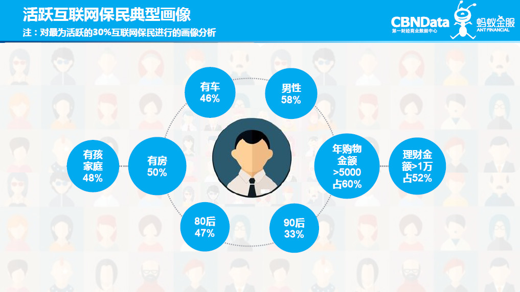 已经成家立业的年轻人在保民群体中显得最为活跃,CBNData《报告》显示,在最为活跃的30%互联网保民当中,48%已经组建家庭并有了孩子。