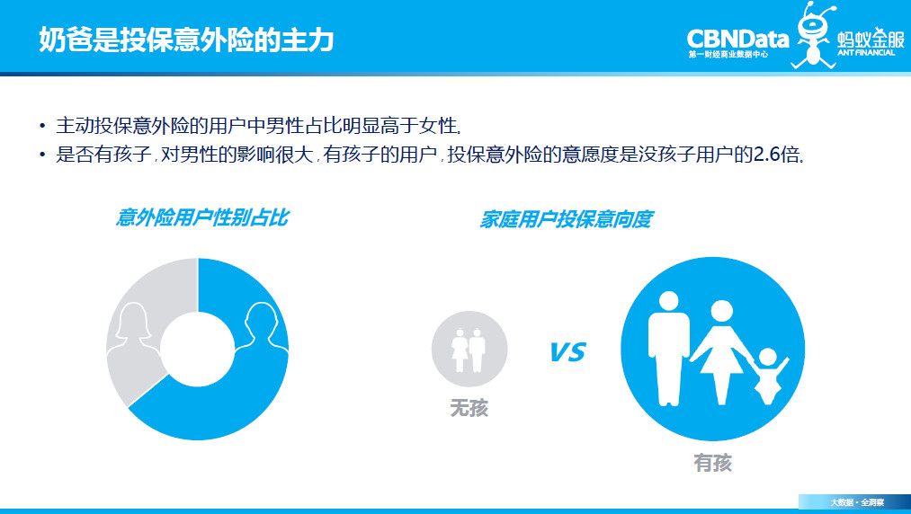 在一个家庭中,保险理财的任务多半由男生承担,而是否有孩子,对男生的影响非常巨大,有孩子的用户,投保意外险的意愿是没孩子用户的2.6倍之多,投保健康险意向则是没孩子用户的2.4倍,“奶爸”成为家庭保险消费的主力人群。在“二孩”政策放开的背景下,奶爸们对未来家庭保险消费的带动力还会体现得更为强劲。