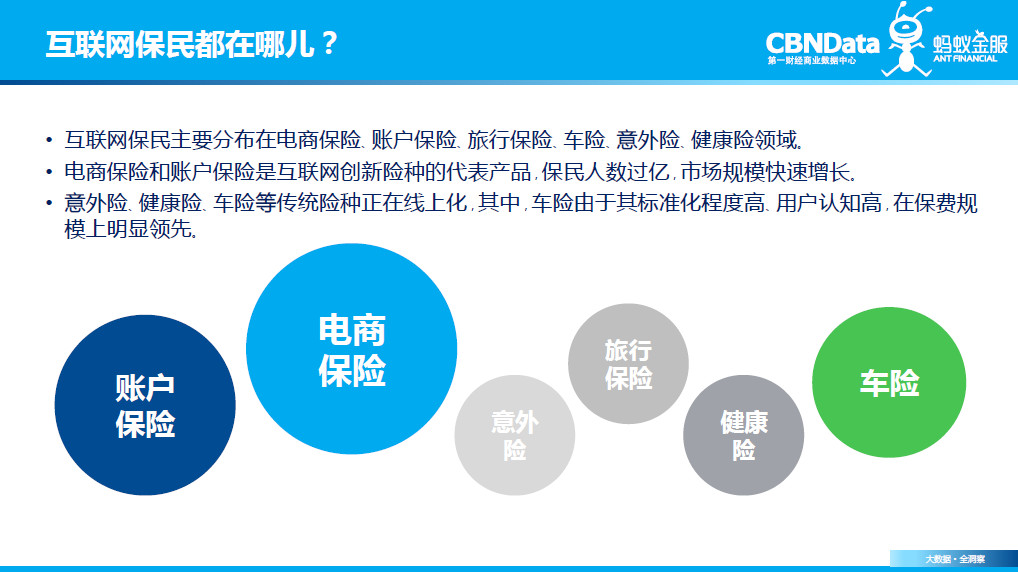 在蚂蚁金服保险平台上,保民主要集中在电商保险、账户保险、旅行保险、车险、意外险、健康险领域。保民的购买行为反映出不同的生活方式,而这些特征也为互联网保险未来的精准运营提供了参考。