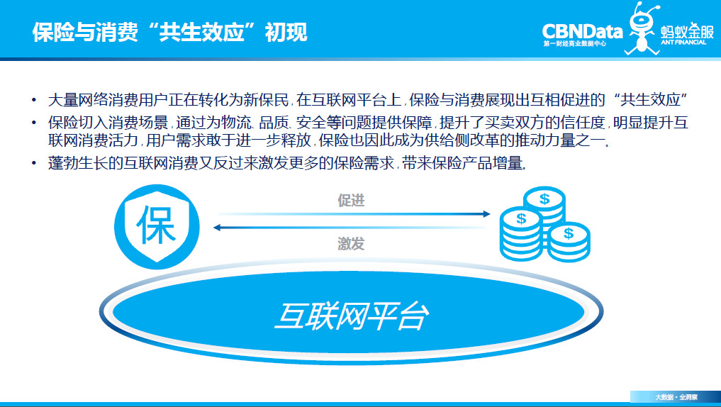 “大量网络消费者正在转化为新保民,在互联网平台上,保险与消费展现出互相促进的‘共生效应’。” 蚂蚁金服保险数据实验室分析师汤国权点评说,“保险切入消费场景,提升互联网消费活力,用户需求敢于进一步释放,另一方面,蓬勃生长的互联网消费又反过来激发更多的保险需求,带来增量。”