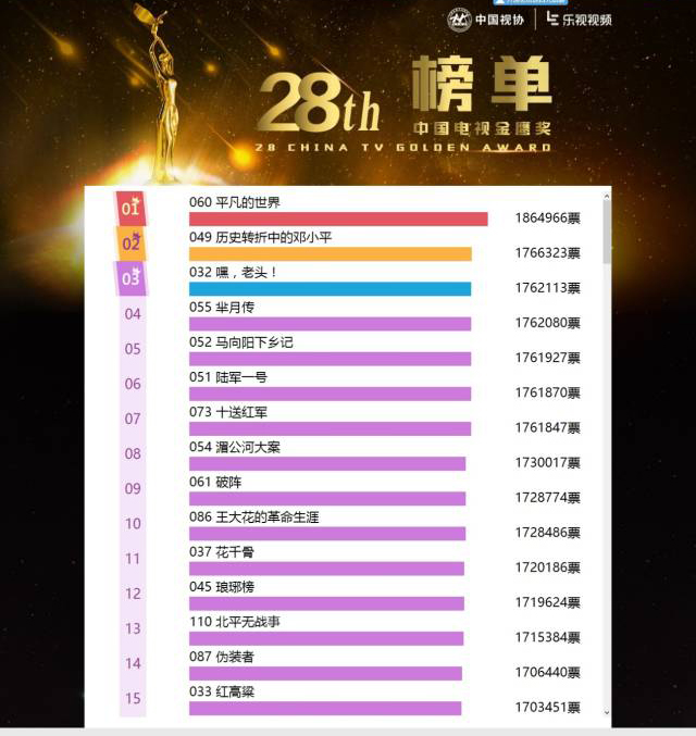 2016年第28届中国电视金鹰奖第一阶段电视剧投票,于7月31日在官网正式结束,累计投票用户接近400万,平均每天7万人。本届金鹰奖囊括了过去两年(2014年3月-2016年3月在电视台正式播出过)的众多优秀电视剧作品,包括《平凡的世界》《芈月传》《琅琊榜》《红高粱》《伪装者》《北上广不相信眼泪》《虎妈猫爸》等掀起全民讨论热潮的热门大剧。从奖项设置数量和参评作品数量的对比来看,本届评选的竞争非常激烈。由SMG尚世影业出品的《平凡的世界》以186万余票的绝对优势在120部电视剧中脱颖而出,问鼎线上评选冠军,代表了观众对这部温暖正能量大作的高度认可与肯定。