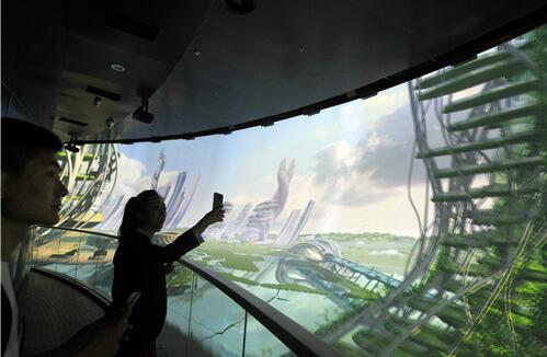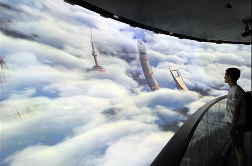 数字影像艺术投影秀片长7分钟,当观众置身于240°环幕中时,东方明珠塔将化身一台巨大的时光机器,带领大家纵情畅游,以宏观的角度观察和欣赏未来上海的智能住宅、生态景观、立体高效交通、和谐自然和文化活力,领略智能科技带来的无穷魅力。再加上场馆内独特设计的移动步道、全景式动感影像、思维立体声场,观众自动穿梭于被影像包围的奇幻空间里,时而鸟瞰城市,时而潜入水底,时而置身云端,时而星际穿越……这种行径式的视觉欣赏路线使观众获得犹如飞越、穿行、遨游等多种沉浸式体验,进行数字媒体虚拟对象与人之间最自然、和谐的情感交流。