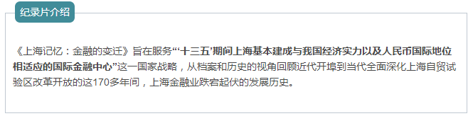 5月24日,由上海市档案局(馆)联合真实传媒有限公司精心策划制作的八集微纪录片《上海记忆:金融的变迁》将在上海电视台纪实频道首播。