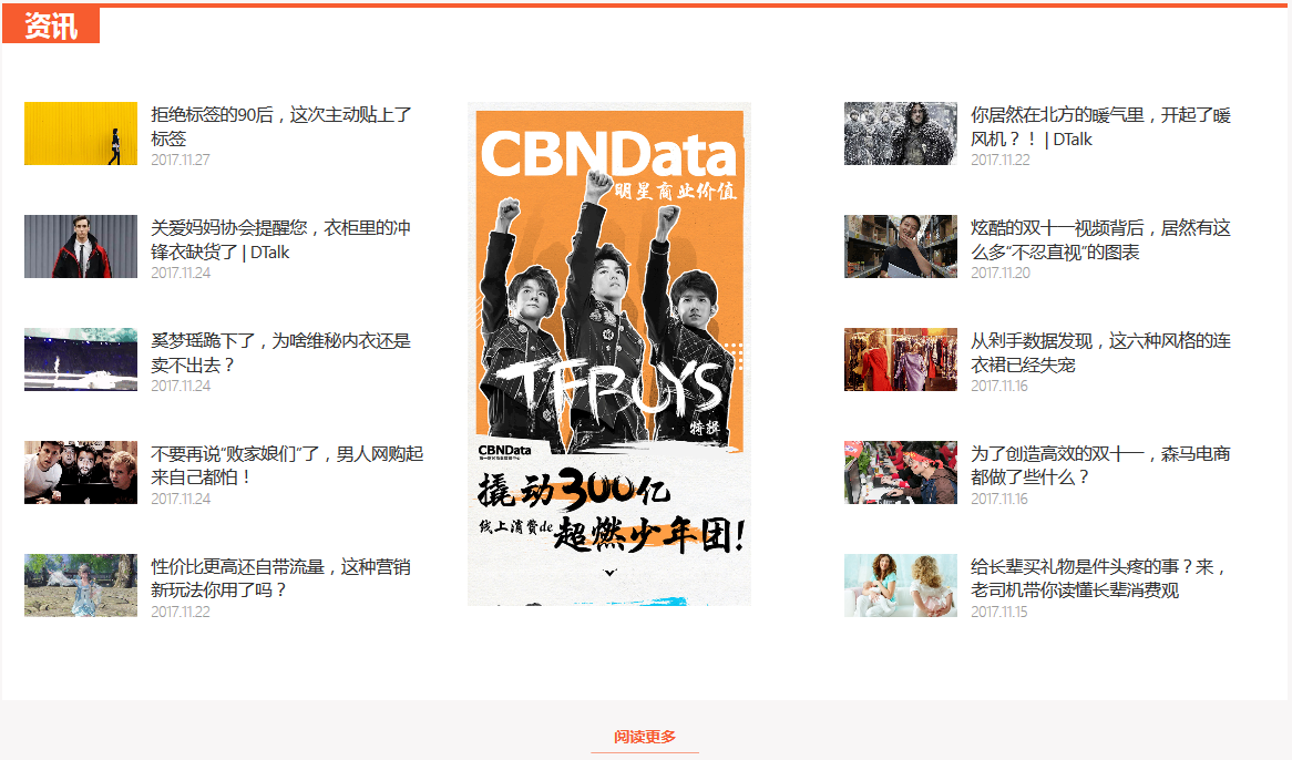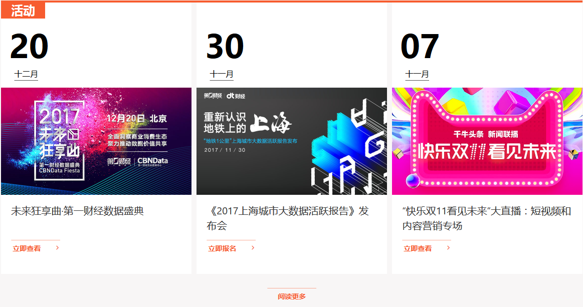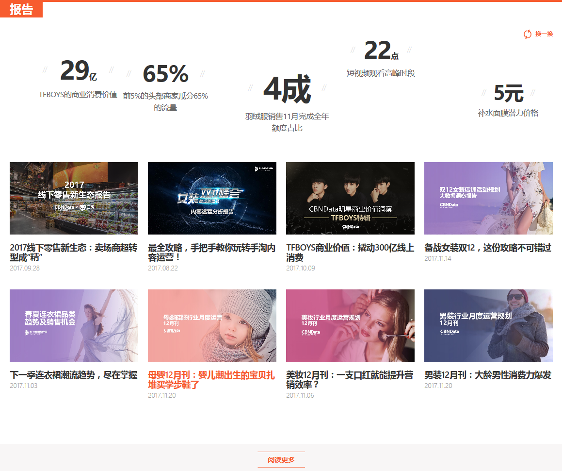 新版CBNData官网设立了报告、资讯和活动三大频道:报告频道囊括了CBNData商业研究、电商咨询在内的所有专业研究报告;资讯频道将及时传递报告解读、案例研究、行业资讯、数图、视频等最鲜活有趣的数据内容;活动频道将随时同步CBNData线上和线下精彩纷呈的数据论坛和数据沙龙。