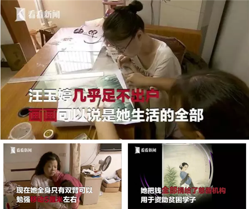 爱是可以使人坚强,患有严重肌营养不良症的汪玉婷,手臂只能移动5厘米,却拿起画笔绘出一片斑斓,成为一名画家,还用画作拍卖所得的30多万元捐资助学,她的心灵和笔端晕开的墨色一样美丽。