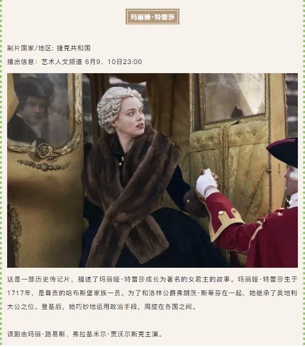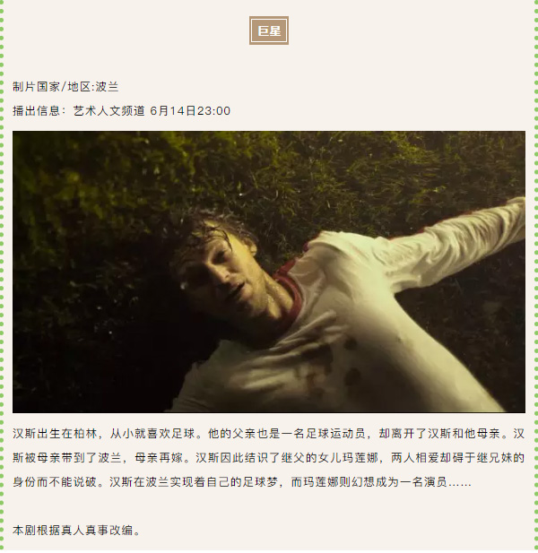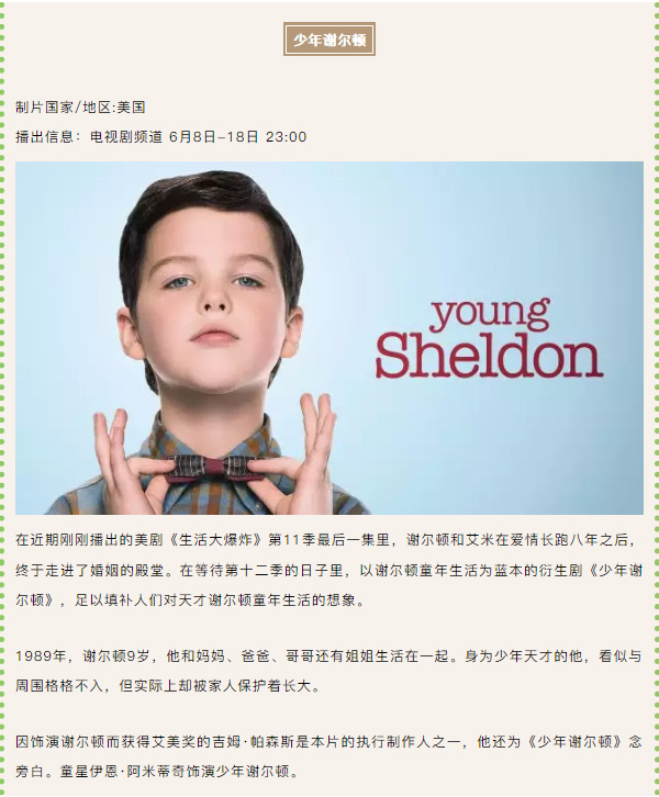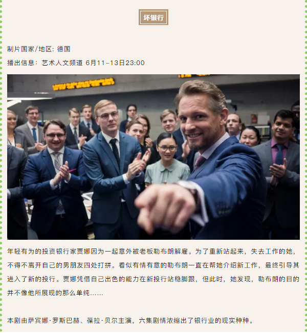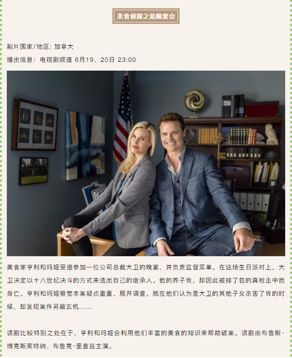 6月8日至6月20日,每晚23点,上海电视台电视剧频道与艺术人文频道将给荧幕前的观众们带来一场视觉的盛宴,共八部来自各国的优秀电视剧作品将在此期间逐一亮相,使观众有机会一口气集齐美国、德国、加拿大、摩洛哥坦等国家最新鲜当红的电视剧。
