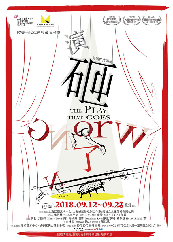 由上海话剧艺术中心、上海捕鼠器戏剧工作室、天首立文化传播有限公司联合制作出品的奥利弗奖最佳新喜剧•英国经典闹剧 《演砸了》(The Play That Goes Wrong)中文版9月13日晚在虹桥艺术中心欢乐上演。该剧由上海话剧艺术中心优秀导演林奕执导,由英国编剧亨利•刘易斯、乔纳森•塞尔和亨利•希尔兹共同担任编剧。本轮演出,《演砸了》由复排导演罗茜携手一众优秀演员祖永宸、童歆、顾鑫、王维帅、周子单、张羴、李黎、倪昊共同呈现。