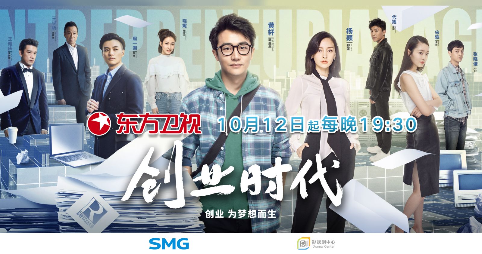 由傅斌星担任总监制,安建执导,张挺编剧,路钶、张薇担任制片人,黄轩、杨颖领衔主演,周一围、宋轶、啜妮、代旭、印小天、代乐乐、张晓谦、范津玮联合出演,王学圻、王耀庆特邀出演,李建义、韩童生、赵君、王同辉、苏可友情出演的电视剧《创业时代》将于10月12日起登陆东方卫视黄金剧场,每晚19:30两集连播。